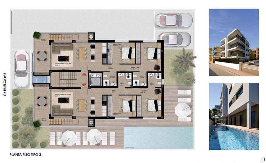 Apartamenty na poddaszu i luksusowe mieszkania 2 sypialnie, z tarasem, basen na terenie wspólnym, miejsce parkingowe i komórka lokatorska w okolicy Wielkiej Plaży w Santa Pola. Osiedle Huesca to nowa inwestycja z pięknymi widokami na morze, położona tuż przy plaży, w Santa Pola.