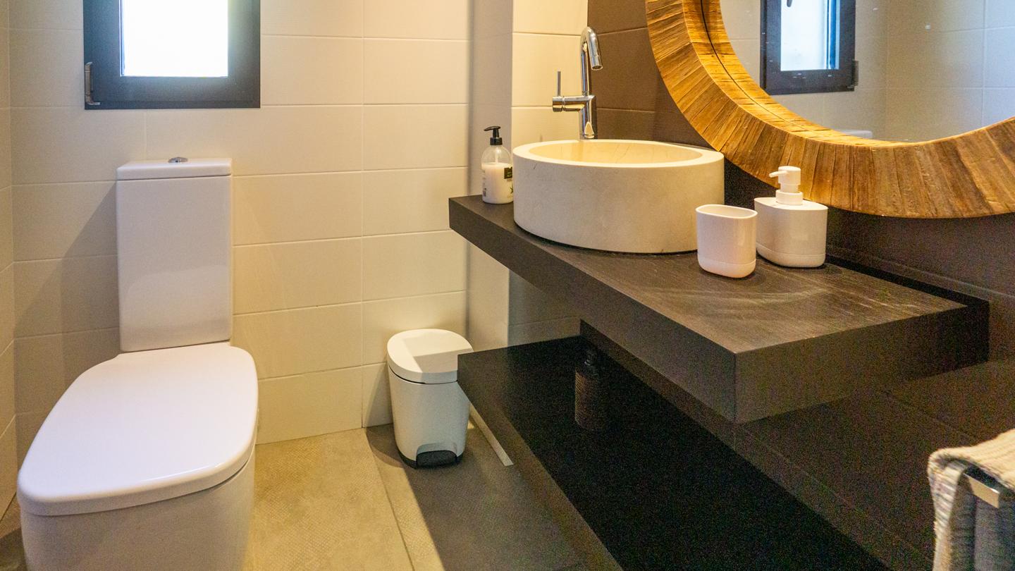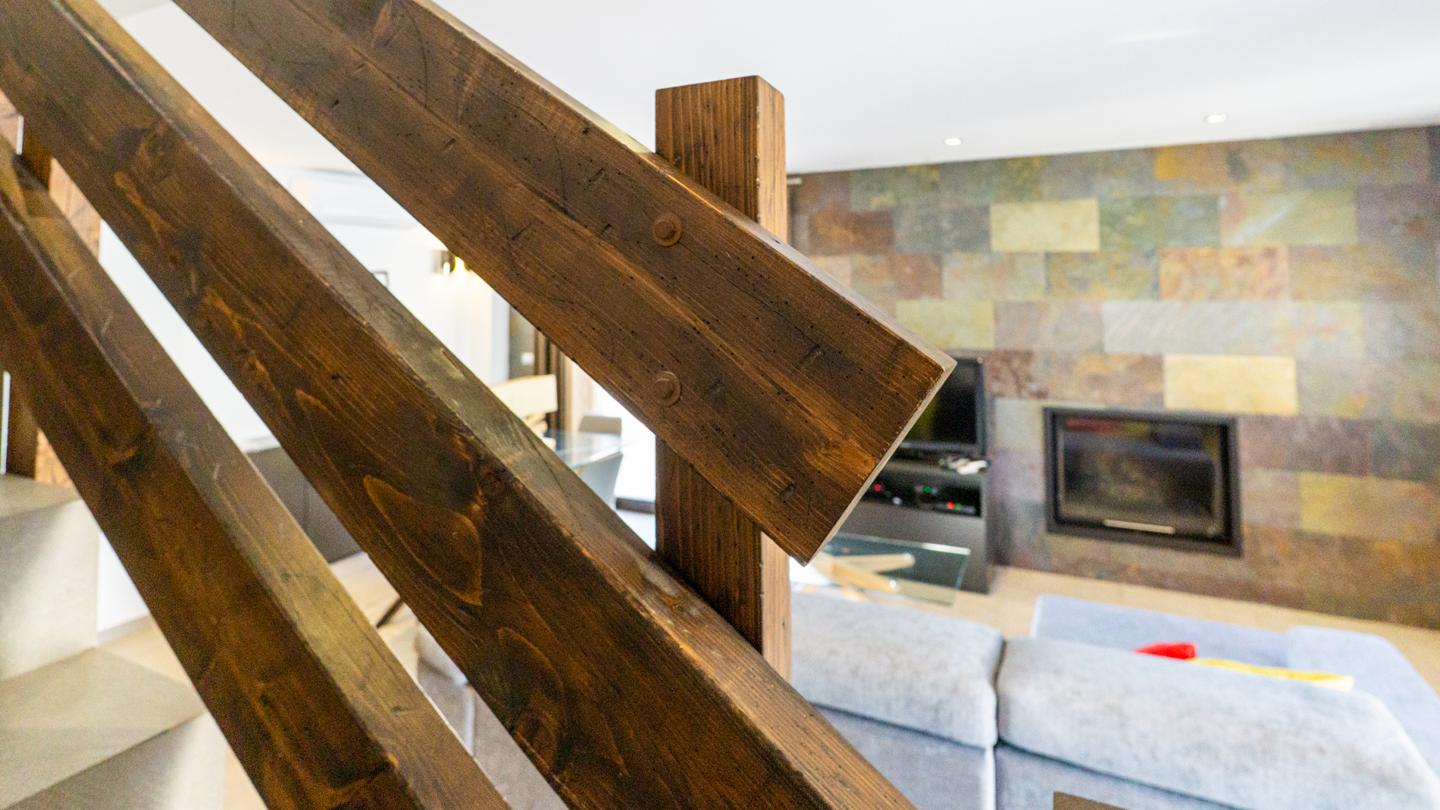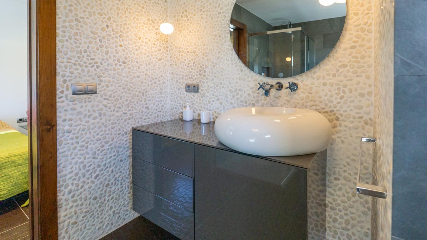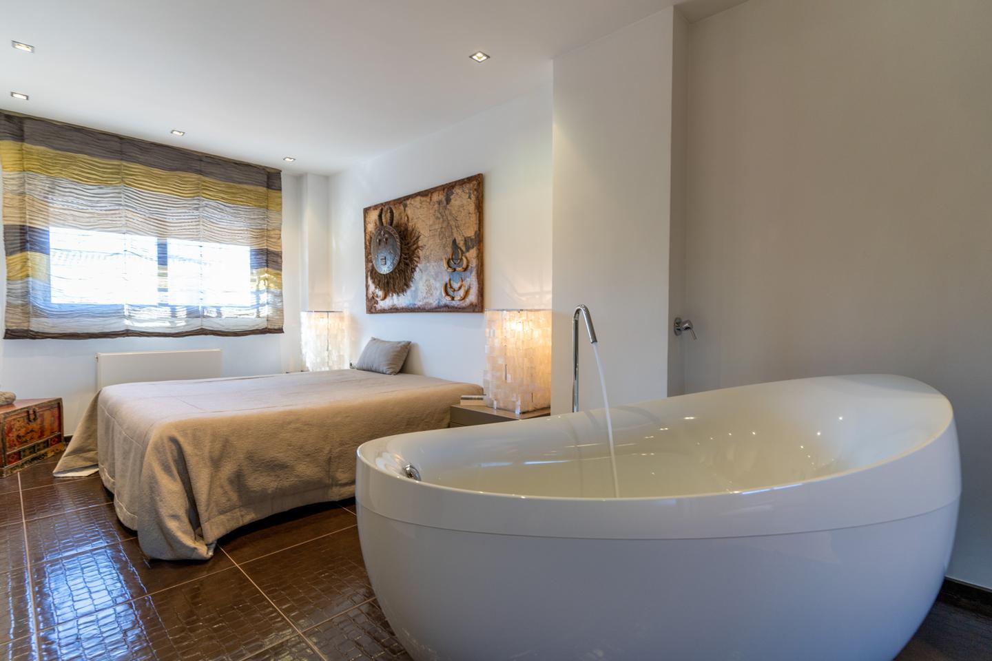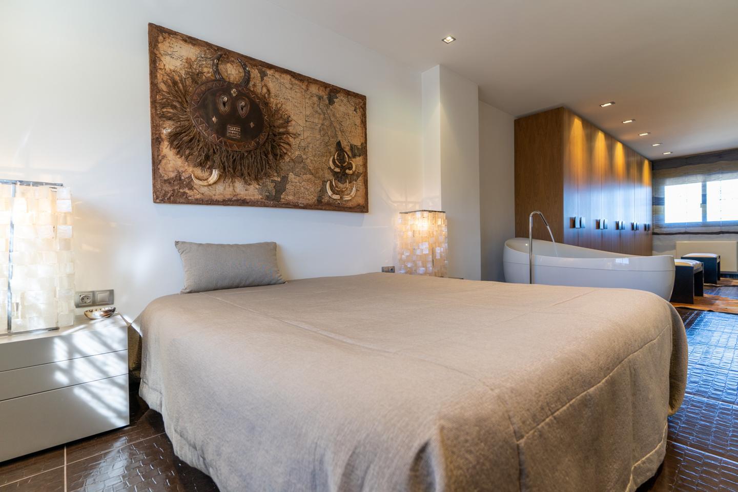 Las escaleras dan acceso a la planta superior, en la que están los 3 dormitorios y 2 cuartos de baño. El dormitorio principal es un espacio fantástico, plagado de elementos ideales para optimizar la calidad de vida. Incluye una bonita bañera de diseño al lado de la cama, lo que te permitirá disfrutar de relajantes baños en cualquier momento del día. Esta habitación tiene un baño en suite, con sanitarios de última generación y acabados de altísima calidad. Los otros 2 dormitorios son dobles, perfectos para descansar en un espacio tranquilo. Actualmente uno de ellos funciona como despacho. El segundo cuarto de baño también está equipado y amueblado con excelentes acabados.