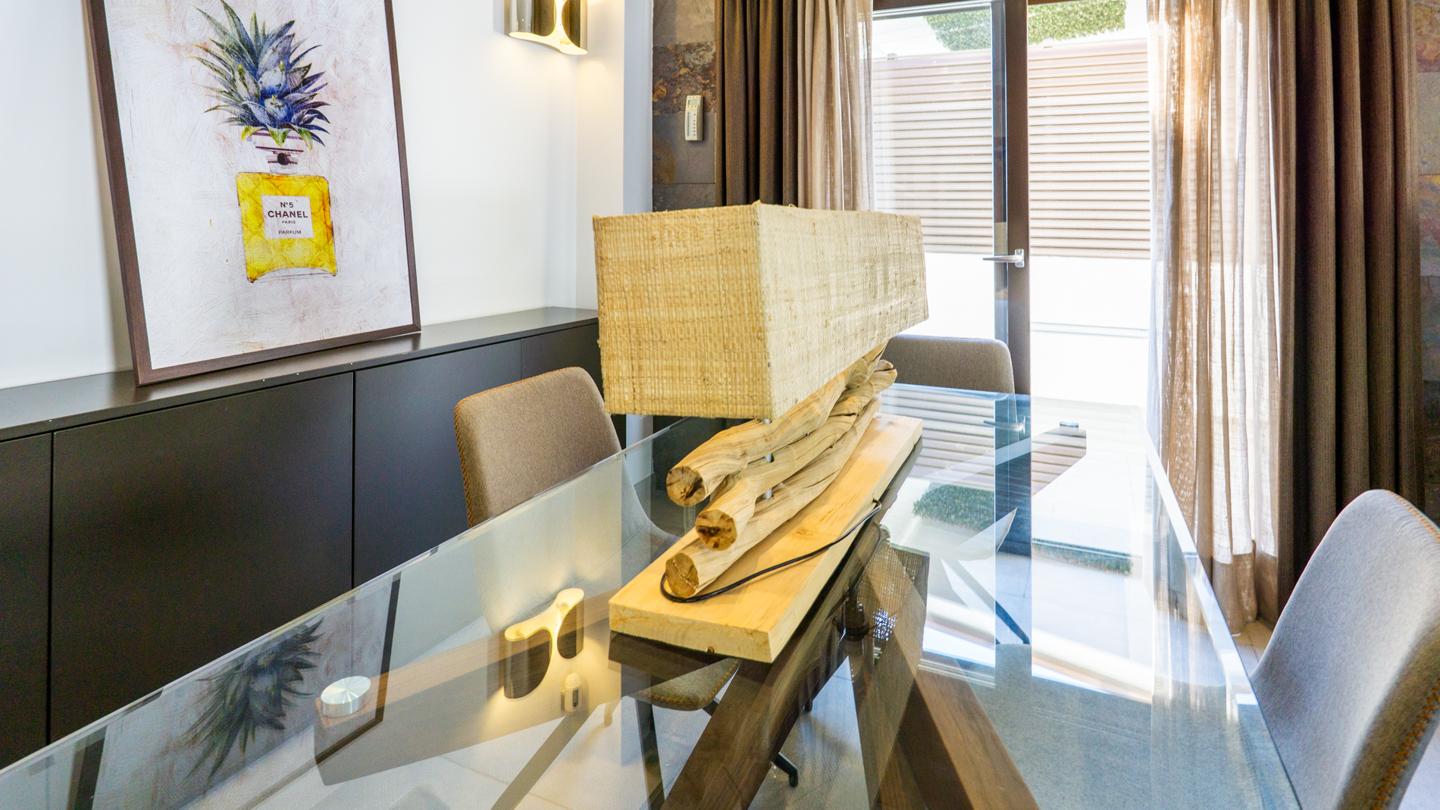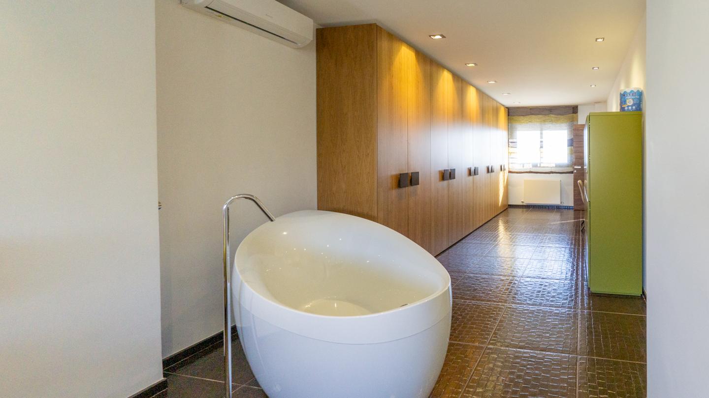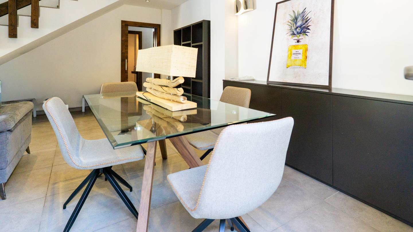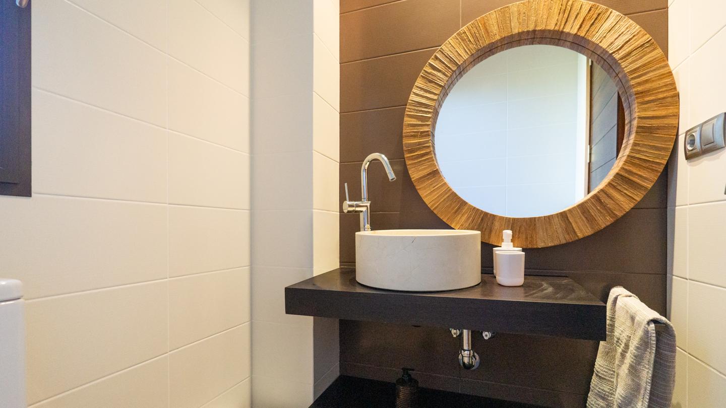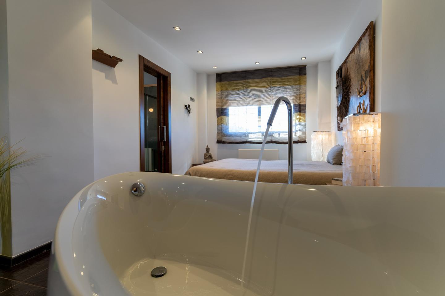 Las escaleras dan acceso a la planta superior, en la que están los 3 dormitorios y 2 cuartos de baño. El dormitorio principal es un espacio fantástico, plagado de elementos ideales para optimizar la calidad de vida. Incluye una bonita bañera de diseño al lado de la cama, lo que te permitirá disfrutar de relajantes baños en cualquier momento del día. Esta habitación tiene un baño en suite, con sanitarios de última generación y acabados de altísima calidad. Los otros 2 dormitorios son dobles, perfectos para descansar en un espacio tranquilo. Actualmente uno de ellos funciona como despacho. El segundo cuarto de baño también está equipado y amueblado con excelentes acabados.