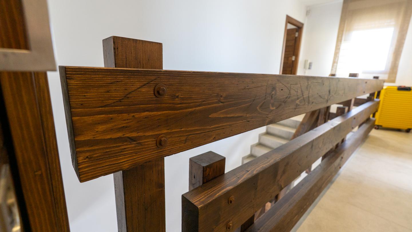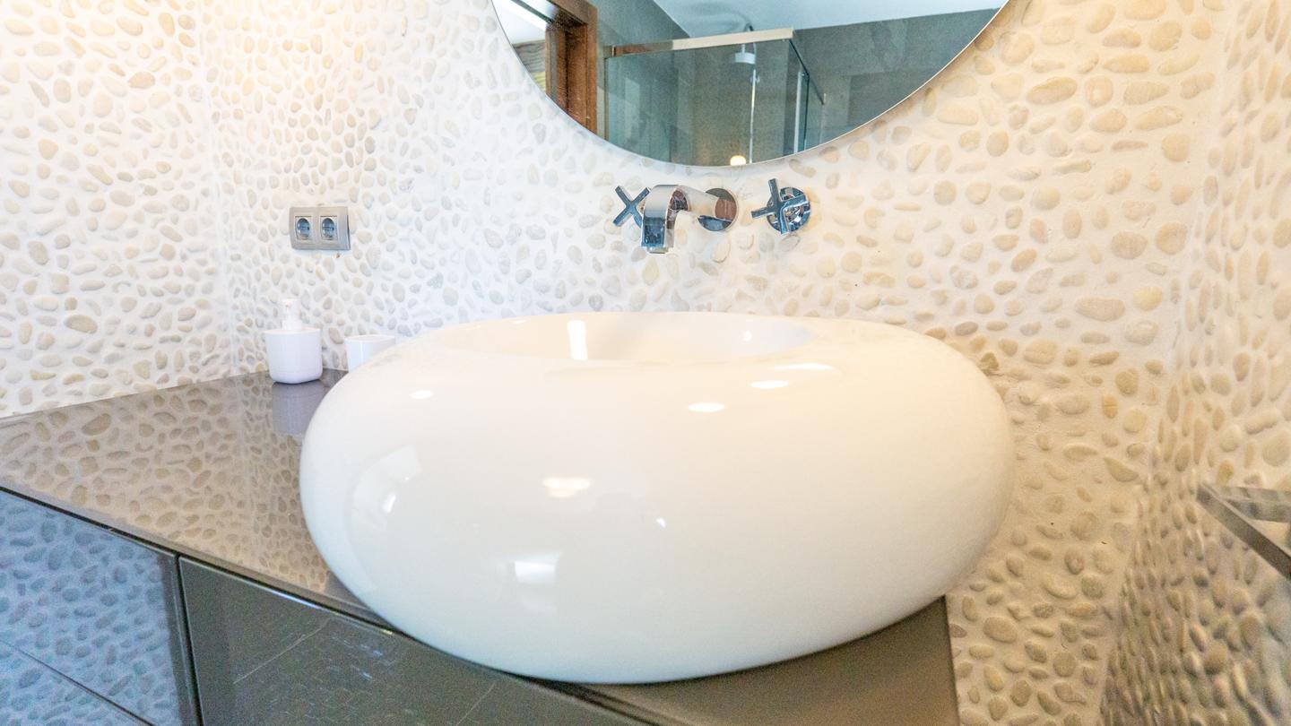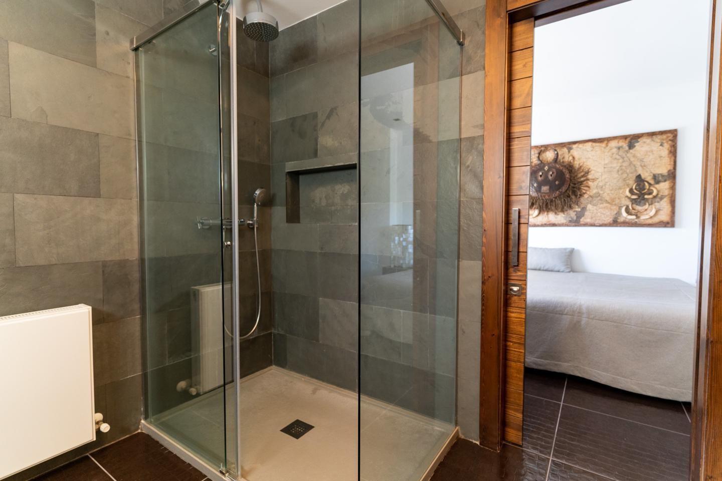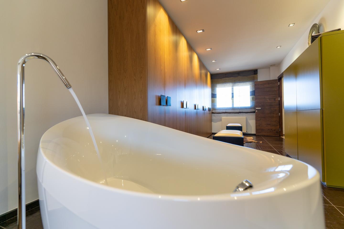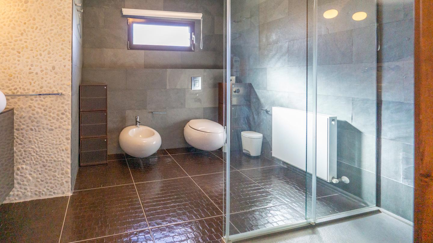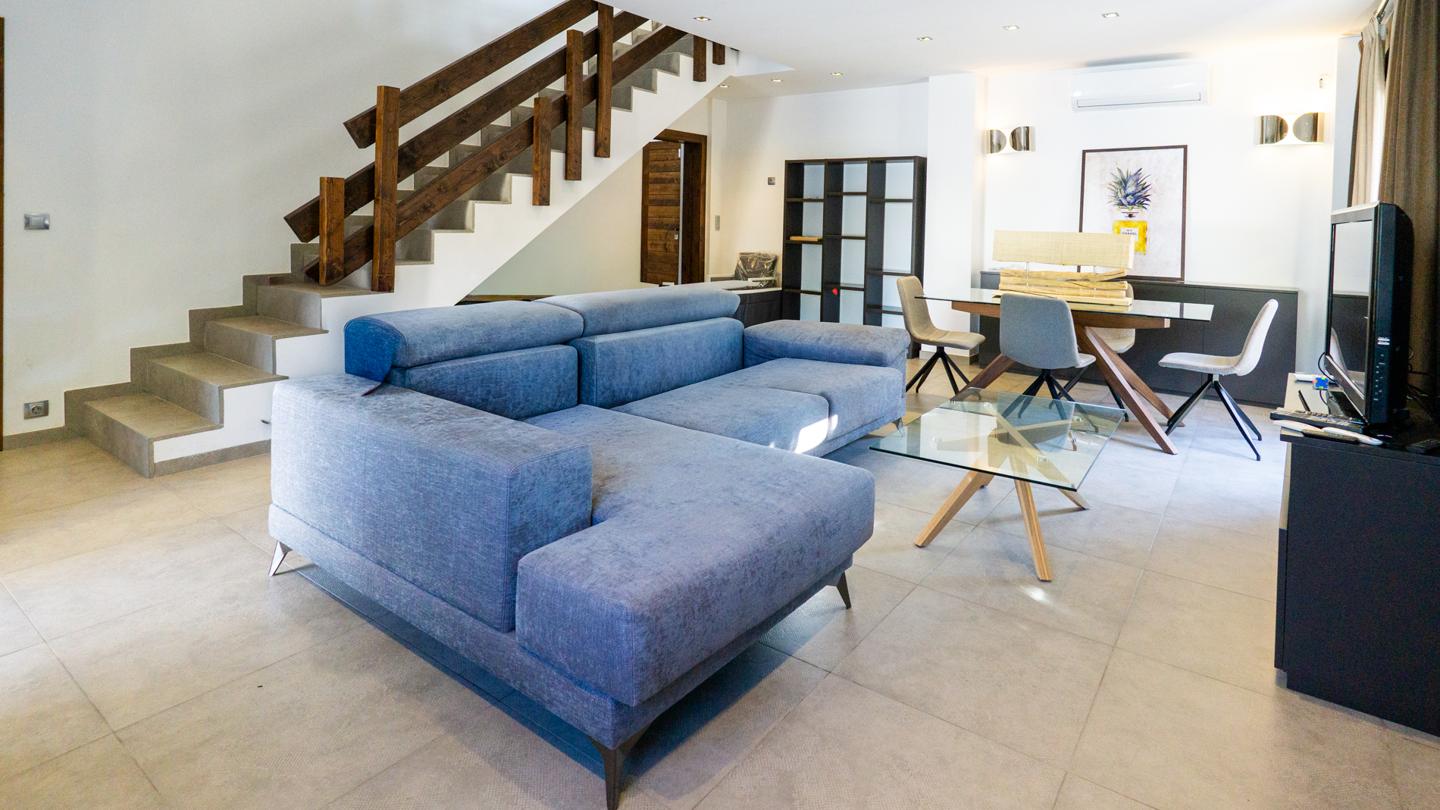 Las escaleras dan acceso a la planta superior, en la que están los 3 dormitorios y 2 cuartos de baño. El dormitorio principal es un espacio fantástico, plagado de elementos ideales para optimizar la calidad de vida. Incluye una bonita bañera de diseño al lado de la cama, lo que te permitirá disfrutar de relajantes baños en cualquier momento del día. Esta habitación tiene un baño en suite, con sanitarios de última generación y acabados de altísima calidad. Los otros 2 dormitorios son dobles, perfectos para descansar en un espacio tranquilo. Actualmente uno de ellos funciona como despacho. El segundo cuarto de baño también está equipado y amueblado con excelentes acabados.