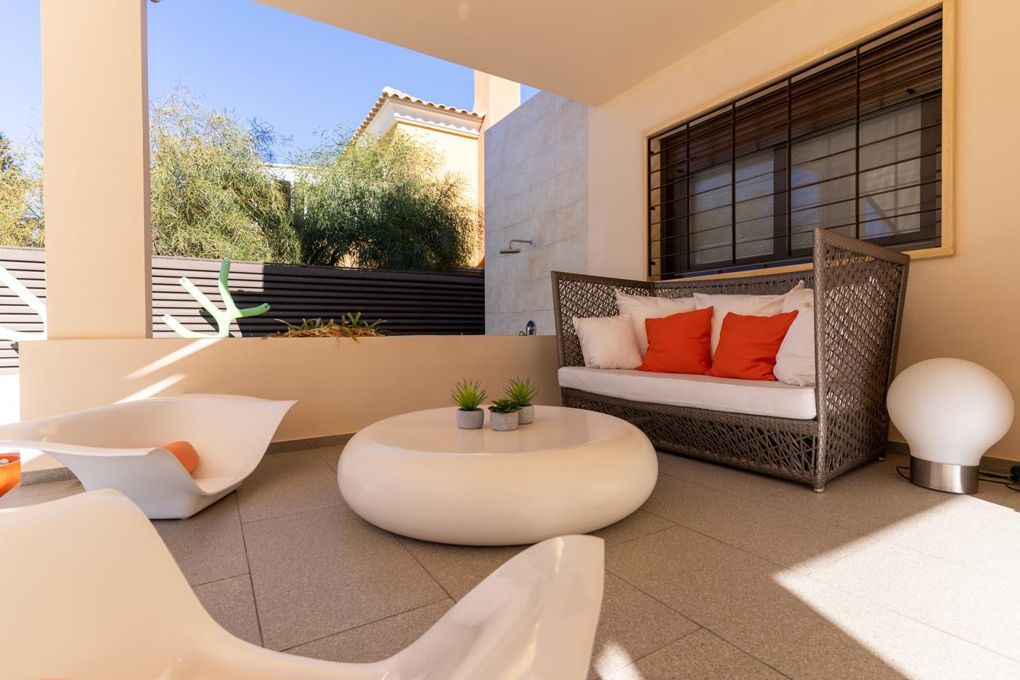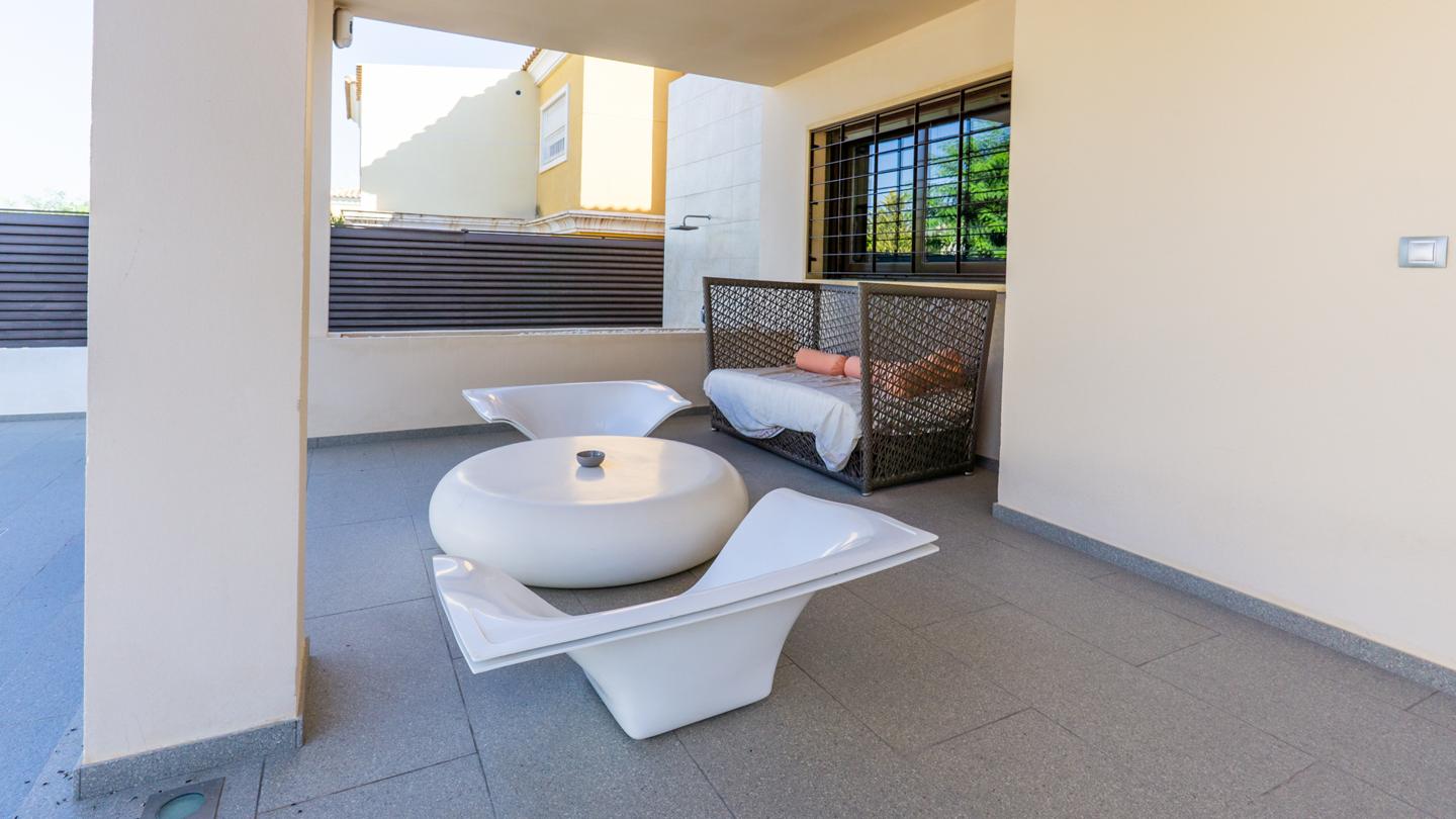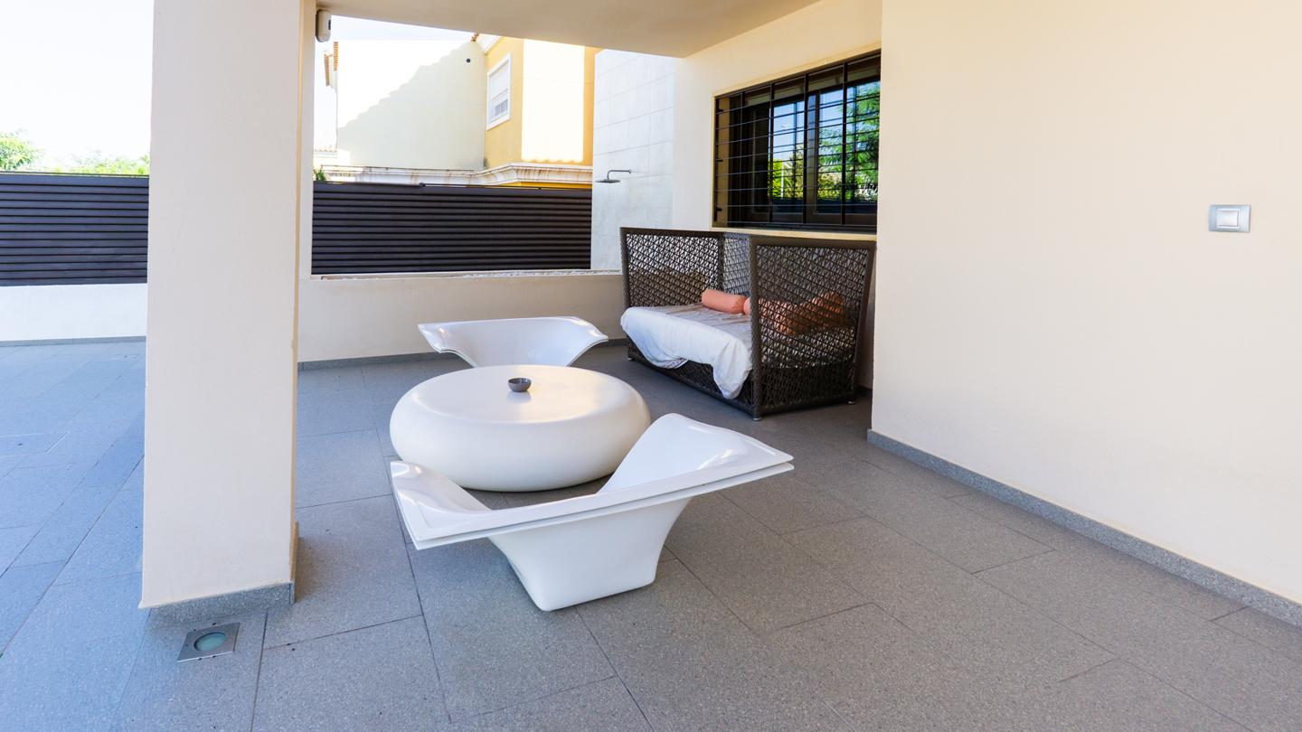 La vivienda se encuentra en una amplia parcela, de cerca de 500 metros cuadrados, donde se ubican magníficas zonas exteriores. Las terrazas han sido creadas a partir de espacios diferenciados, perfectos para disfrutar de momentos maravillosos en el exterior. La propiedad incluye una zona privada de barbacoa, donde se encuentra la barbacoa de obra de muy buena calidad y una excelente cocina amueblada y equipada con lavavajillas, fogones de gas y nevera. Los exteriores de este chalet son ideales para disfrutar del magnífico clima de la zona. Además, hay un trastero independiente, donde se pueden almacenar todo tipo de enseres. La piscina naranja es uno de los elementos diferenciadores y exclusivos de este bonito chalet en el Residencial Santa Elena, de Aspe.