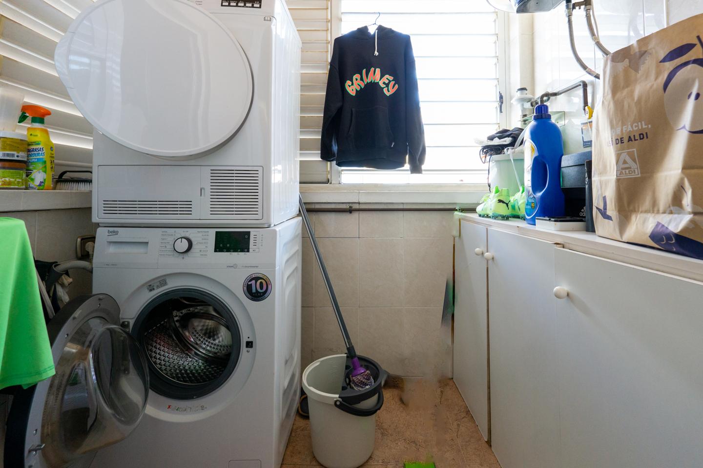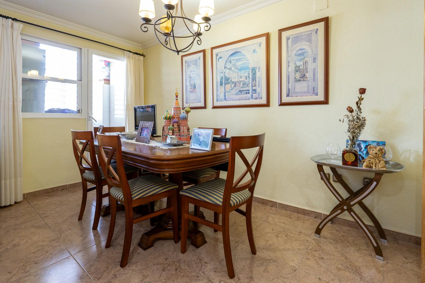 El salón comedor de la casa tiene acceso a una pequeña terraza exterior. Se trata de una estancia grande y muy funcional. La cocina, ubicada justo al lado del salón, es un espacio amplio y moderno, con un mobiliario bien diseñado y electrodomésticos perfectamente adaptados a la vida moderna. Desde la cocina se accede a la despensa y a la zona de lavadero y plancha.