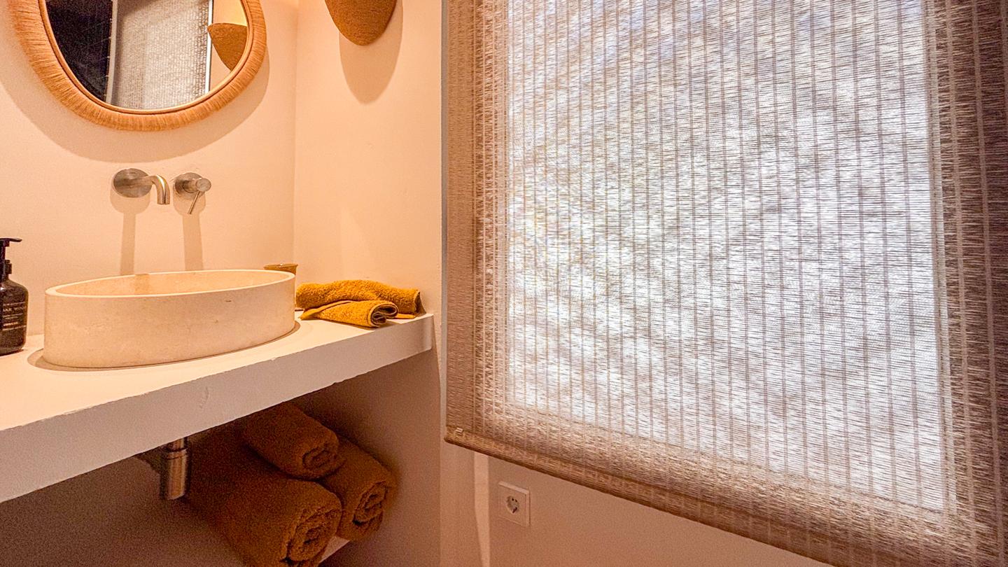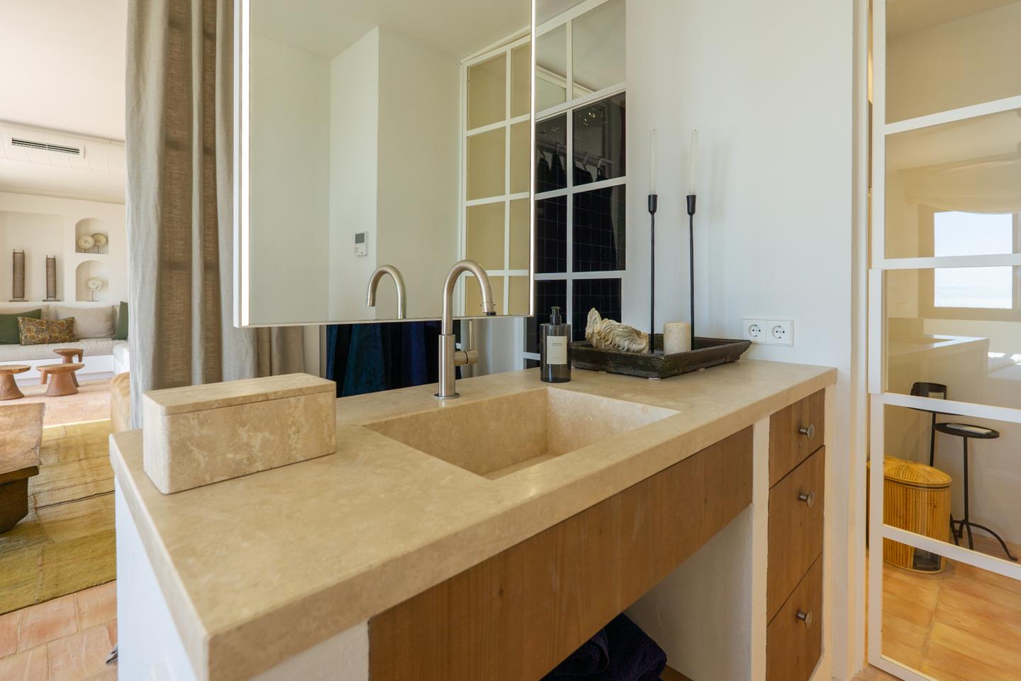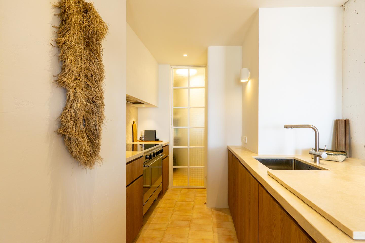 Baños y cocina revestidos en piedra natural.