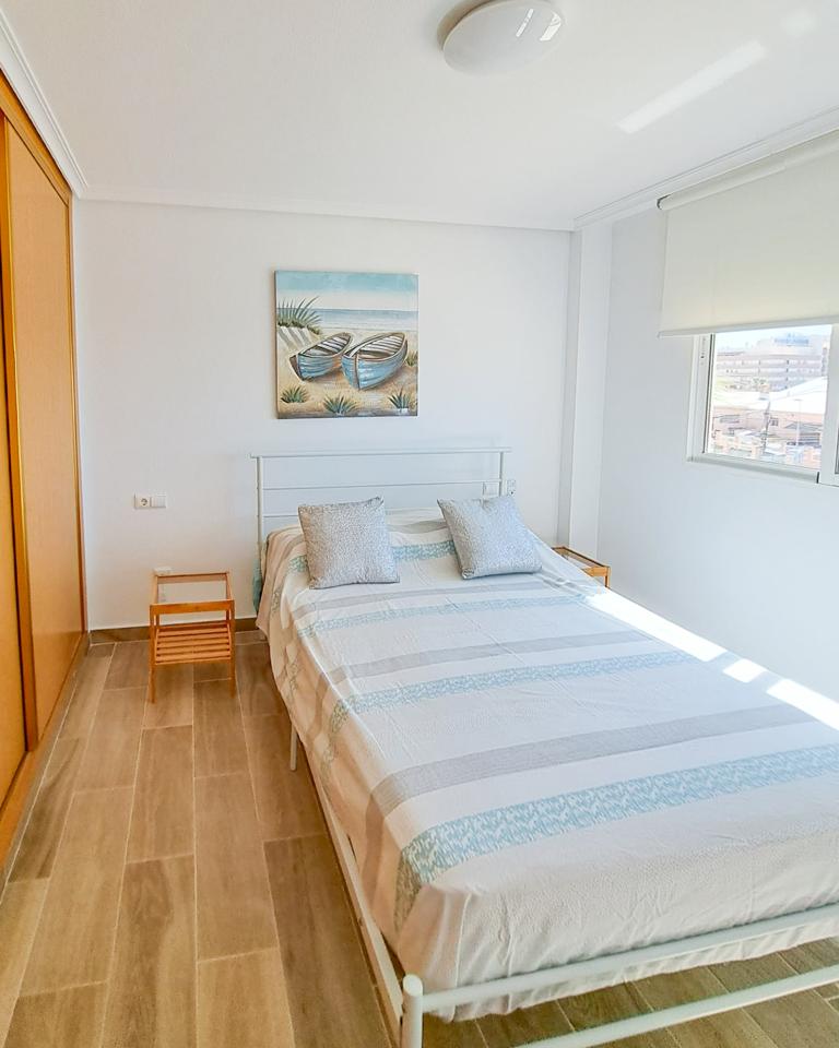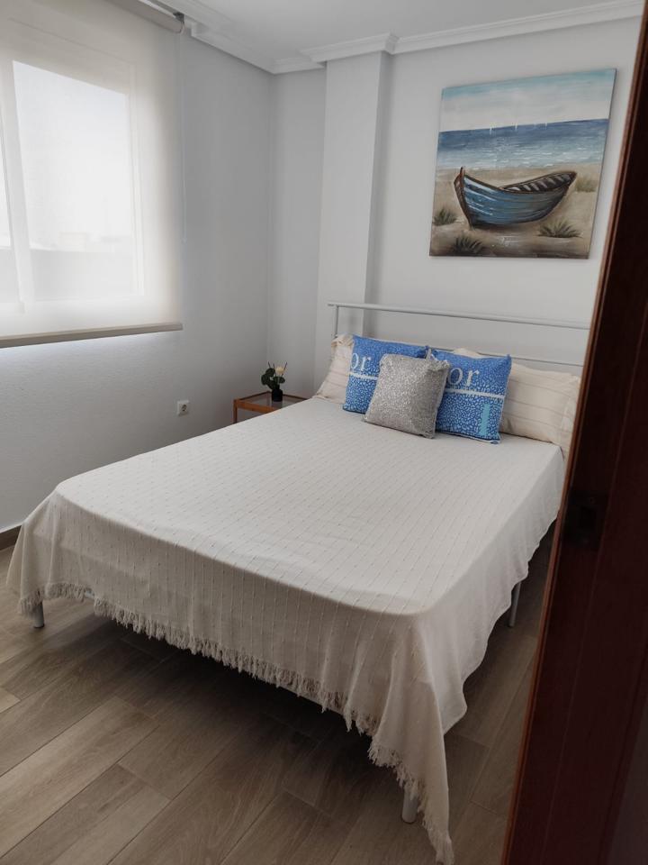 Coqueto y espacioso piso en urbanización con piscina cerca de playa de Torrevieja. Tiene dos dormitorio y un baño.